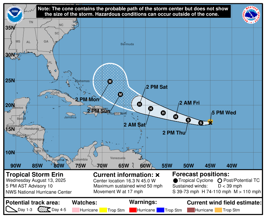 Tropical Storm Erin is on track to develop into a hurricane by Friday. The reports from the National Hurricane Center remain relatively unchanged. The path has started to track slightly north, which is good news and we hope this will continue. We still need to expect and prepare for high winds and heavy rainfall starting most likely on Saturday morning. We will monitor the Virgin Islands Port Authority for port closures.